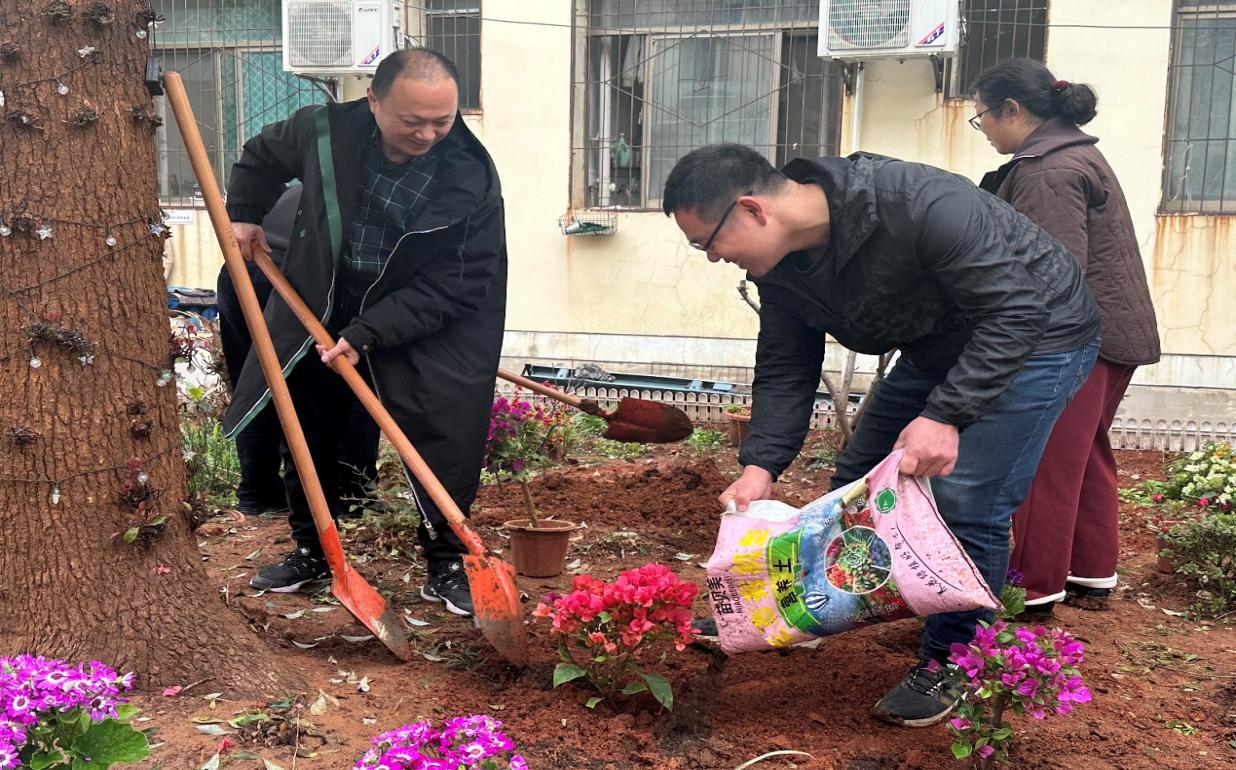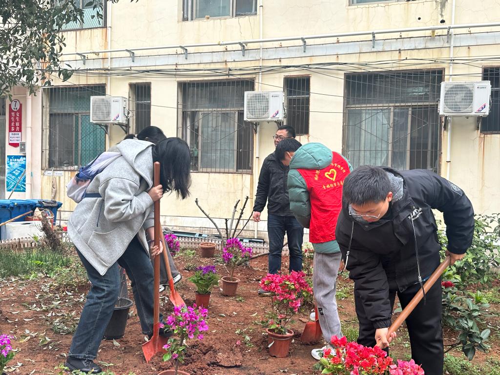 活動現(xiàn)場,師生們熱情洋溢、干勁十足。大家分工明確,默契配合,有的奮力揮動鐵鍬鏟土挖坑,有的小心翼翼地扶正樹苗,有的則提水澆灌,每一個步驟都有條不紊地進行著。師生們齊心協(xié)力,讓一棵棵樹苗、一叢叢花卉穩(wěn)穩(wěn)扎根在土壤中。