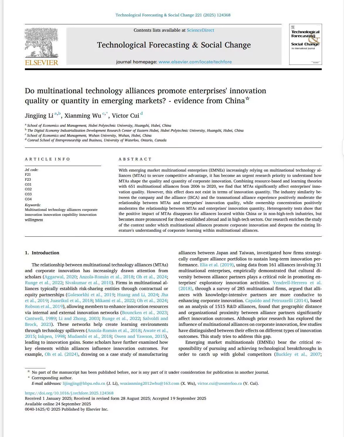 本網(wǎng)消息 近日,湖北理工學(xué)院經(jīng)濟(jì)與管理學(xué)院李京晶副教授的論文《Do multinational technology alliances promote enterprises' innovation quality or quantity in emerging markets?—Evidence from China》在國際頂級學(xué)術(shù)期刊Technological Forecasting & Social Change正式發(fā)表。該期刊為SSCI一區(qū)TOP期刊,在科技創(chuàng)新與戰(zhàn)略管理領(lǐng)域具有重要國際影響力。這是湖北理工學(xué)院經(jīng)濟(jì)與管理學(xué)院首次在影響因子為13.3的一區(qū)頂刊發(fā)表學(xué)術(shù)論文,標(biāo)志著湖北理工學(xué)院經(jīng)濟(jì)與管理學(xué)院在高水平科研成果產(chǎn)出方面實現(xiàn)了新的突破。