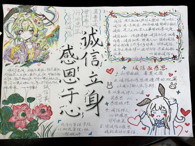 本網(wǎng)消息 11月10日至12日,經(jīng)濟(jì)與管理學(xué)院開展了“誠(chéng)信立身,感恩于心”主題手抄報(bào)活動(dòng)。活動(dòng)一經(jīng)發(fā)布,便吸引了全院學(xué)生廣泛參與,共提交100余份優(yōu)秀作品。