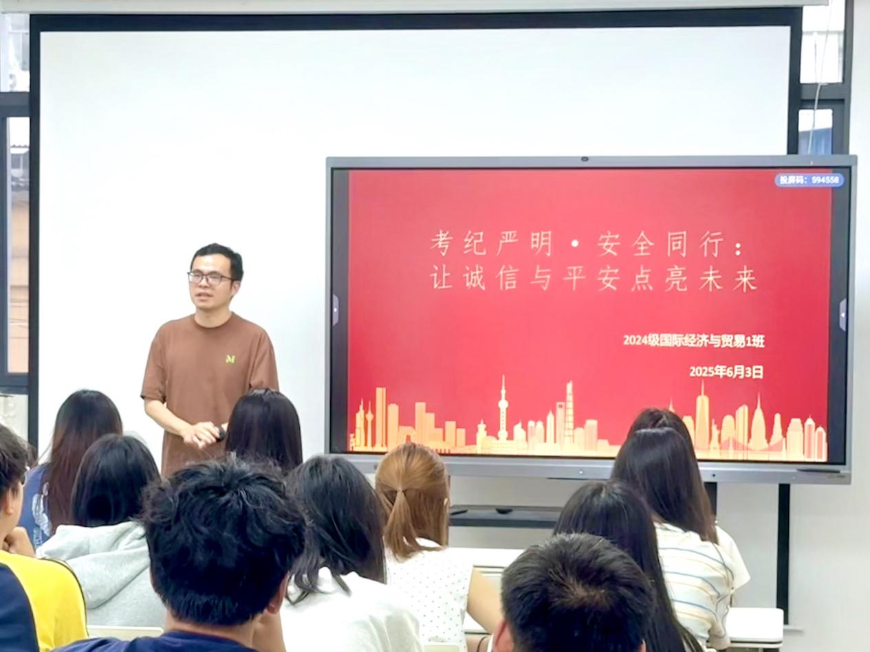 本網(wǎng)消息 為了嚴肅考風考紀,營造誠信考試環(huán)境,經(jīng)濟與管理學院2024級國際經(jīng)濟與貿(mào)易一班于6月3日在求知社區(qū)205教室,召開了考風考紀與校園安全教育主題班會。本次班會由輔導員曾飛老師和黃鵬老師共同主講,24級國貿(mào)一班全體同學參加。